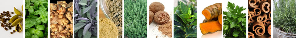 Allspice, anise, basil, bay leaf, caraway, cardamom, chives, chili powder, cinnamon, cilantro, cloves, coriander, cumin, curry, dill, fennel, garlic, ginger, hibiscus, horseradish, jasmine, lemongrass, mustard, nutmeg, oregano, paprika, peppercorns, rosemary, saffron, sage, thyme, turmeric, vanilla, etc.
